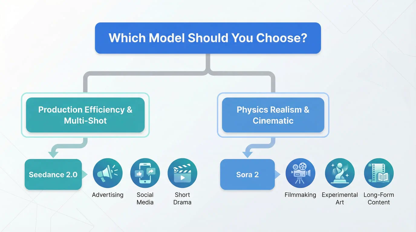 Escolher entre Seedance 2.0 e Sora 2 requer uma avaliação honesta de seus requisitos específicos em várias dimensões: